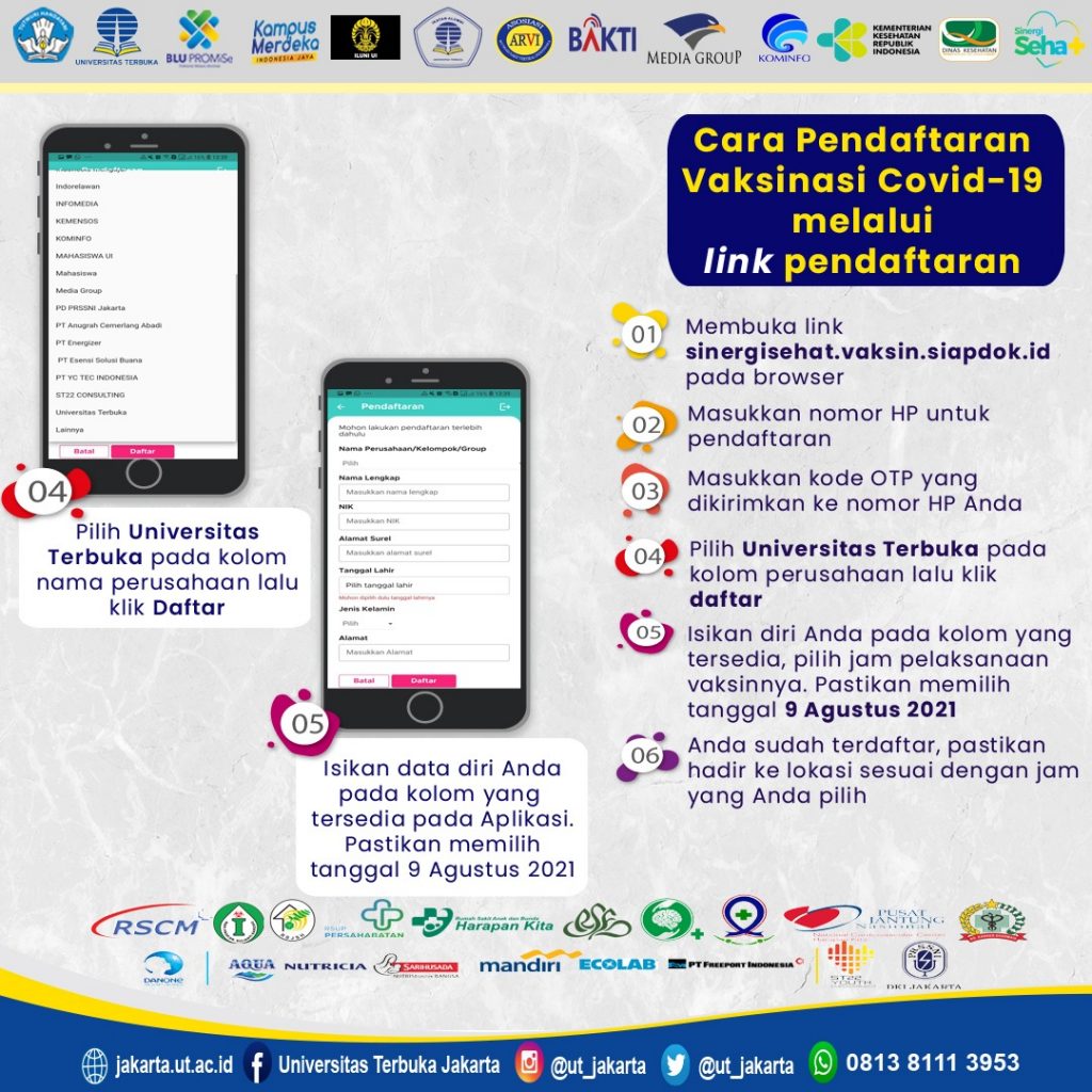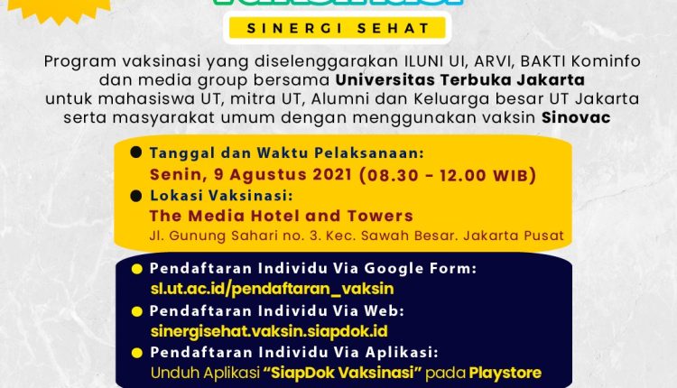 Universitas Terbuka Jakarta bersama Pengurus Pusat dan Pengurus Wilayah IKA UT Jakarta, ILUNI UI, BAKTI Kominfo, Media Group, beserta 10 Rumah Sakit yang tergabung dalam Asosiasi Rumah Sakit Vertikal Indonesia (ARVI) terdiri dari RSCM, RS Fatmawati, RSPI Sulianti Saroso, RS PON, RS Soeharto Heerdjan, RSKO Jakarta, RS Persahabatan, RSJ Harapan Kita, RSAB Harapan Kita, dan RSK Dharmais, didukung oleh Danone Indonesia, membuka Sentra Vaksinasi “Sinergi Sehat” untuk mahasiswa, alumni UT, kelurga besar UT Jakarta serta masyarakat umum berusia minimal 12 tahun. Vaksin yang digunakan adalah Sinovac.